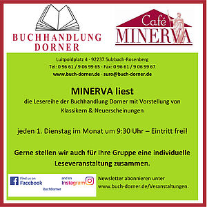 Währen der Lesung versorgt Sie das Team des Café MINERVA mit Getränken und Kuchen. Auch nach der Buchvorstellung bietet sich die Möglichkeit des gemütlichen Beisammenseins bei Kaffee und Kuchen.